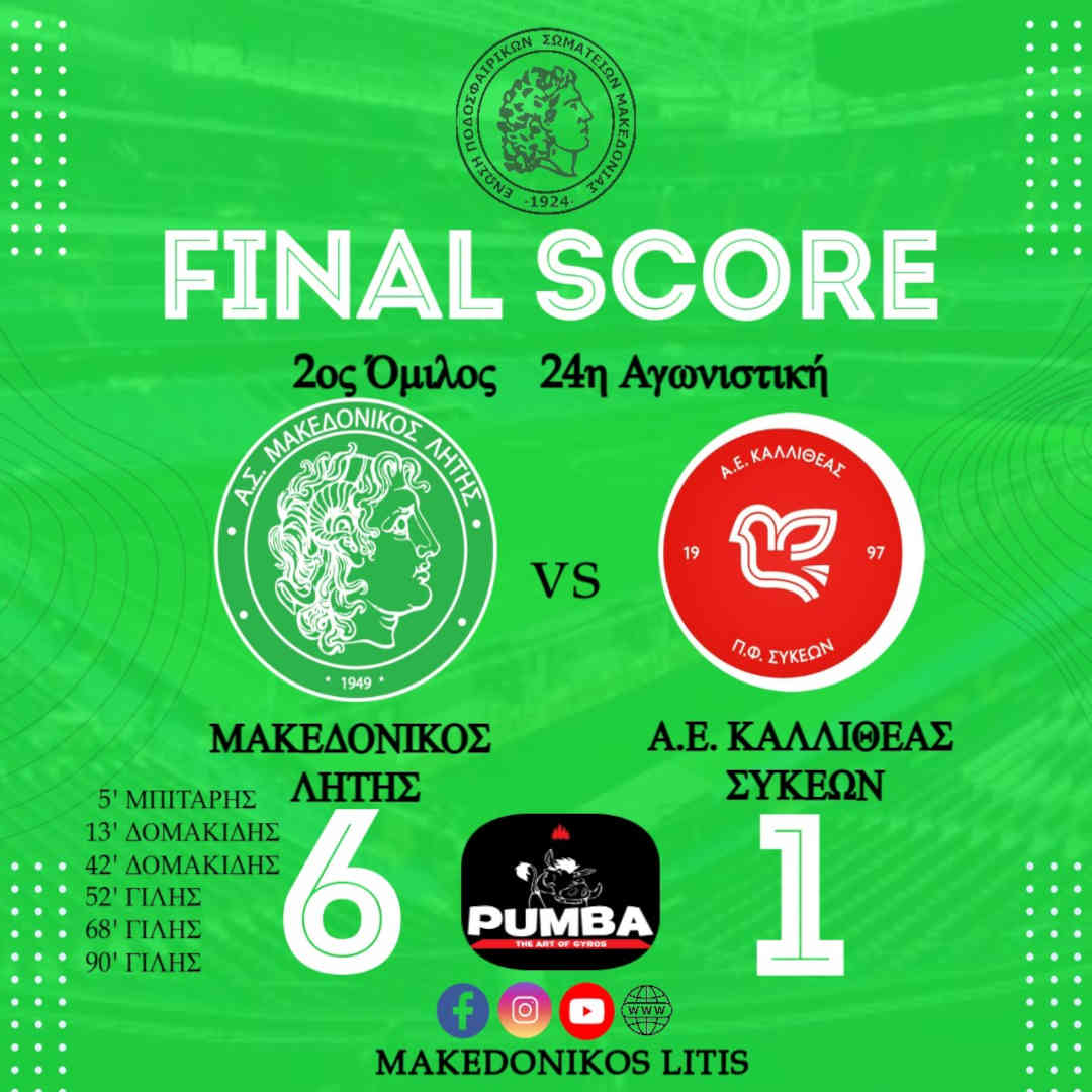 Μακεδονικός Λητής - Α.Ε. Καλλιθέας ΣυκεώνΓκολ και φάσεις από τον αγώνα της ομάδας μας απέναντι στην Α.Ε. Καλλιθέας Συκεών για την 24η αγωνιστική (9η β΄ γύρου) του πρωταθλήματος.