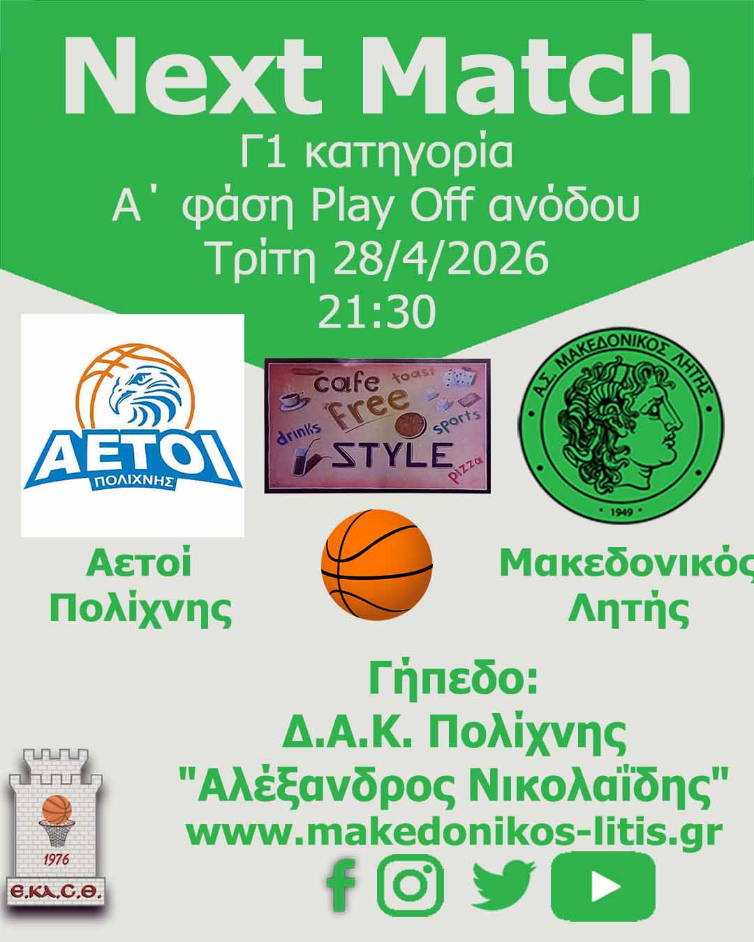 Η ομάδα μας θα αντιμετωπίσει εκτός έδρας τους Αετούς Πολίχνης αύριο Τρίτη 28/4/2026 στις 21:30. Ο επόμενος αγώνας θα γίνει στην έδρα μας την Τρίτη 5/5/2026 και αν απαιτηθεί και τρίτος αγώνας, αυτός θα διεξαχθεί στην έδρα των Αετών Πολίχνης την Παρασκευή 8/5/2026