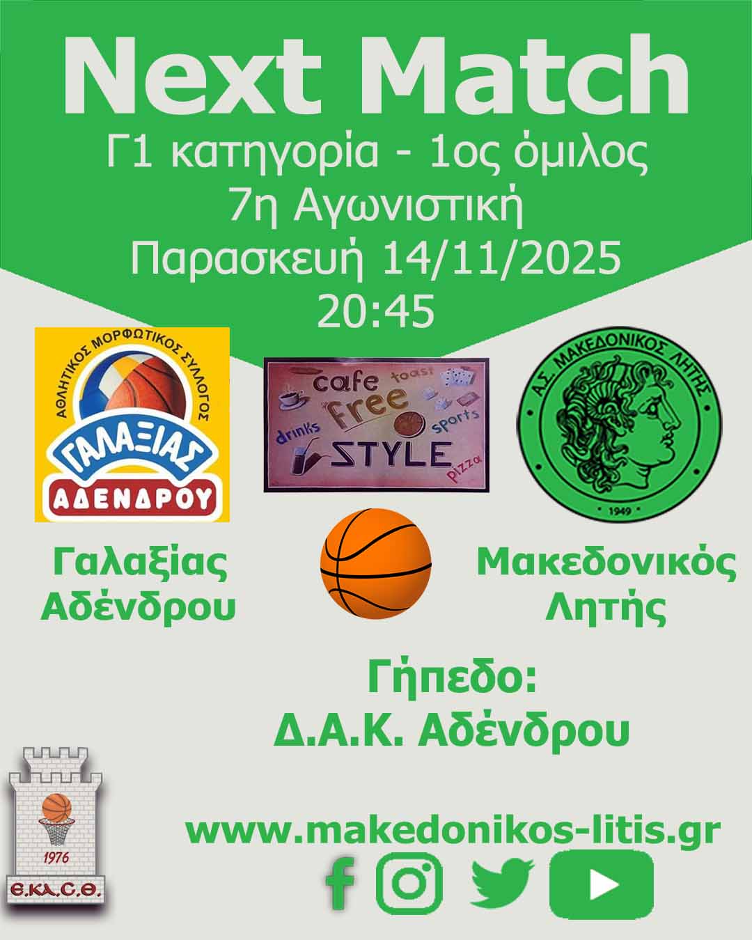 Η ομάδα μας φιλοξενείται στην έδρα του Γαλαξία Αδένδρου για την 7η αγωνιστική του πρωταθλήματος.