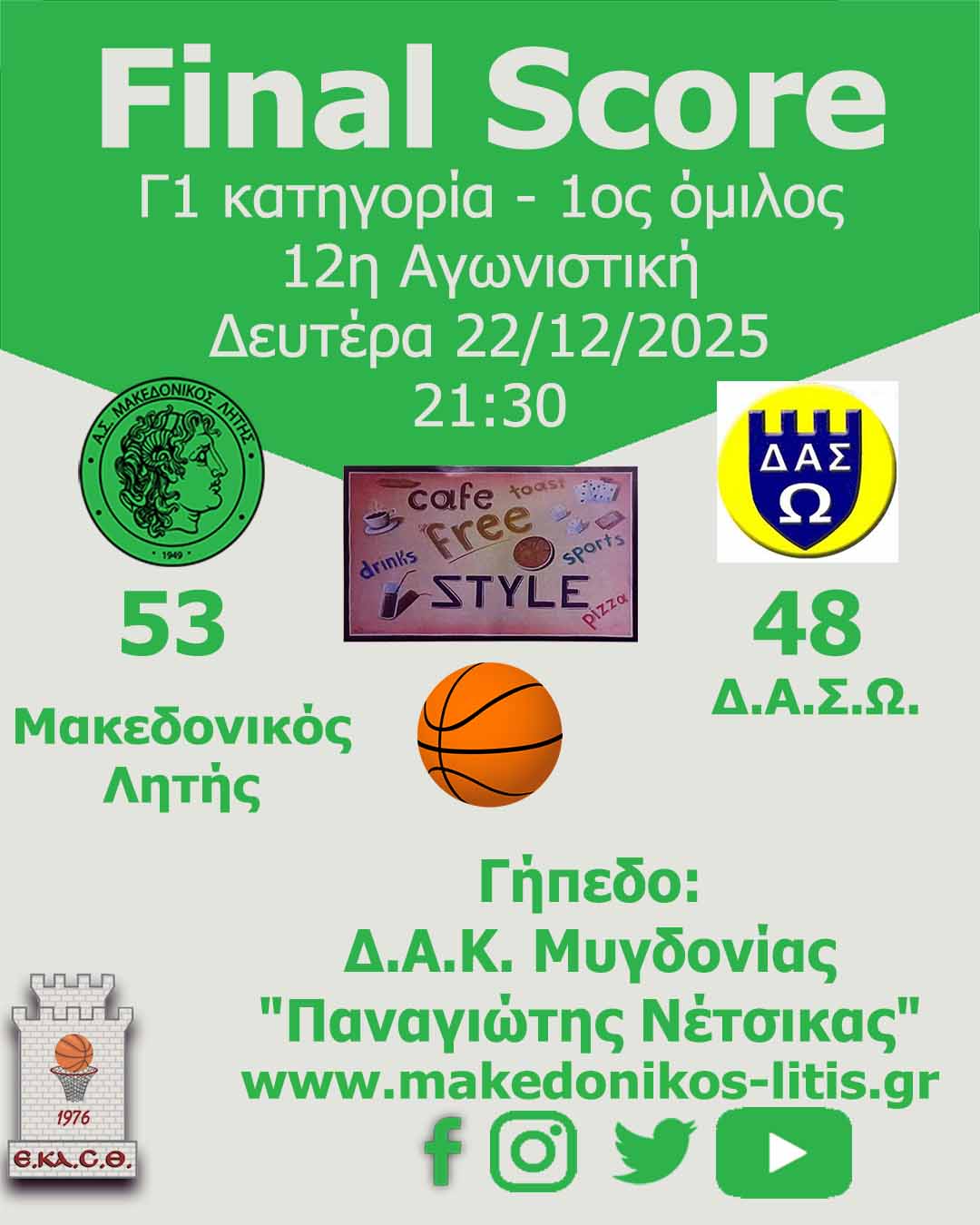🏀 Επέστεψε στις νίκες ο Μακεδονικός Λητής, καθώς επικράτησε του Δ.Α.Σ.Ω. με σκορ 53-48 στον τελευταίο αγώνα για το 2025.