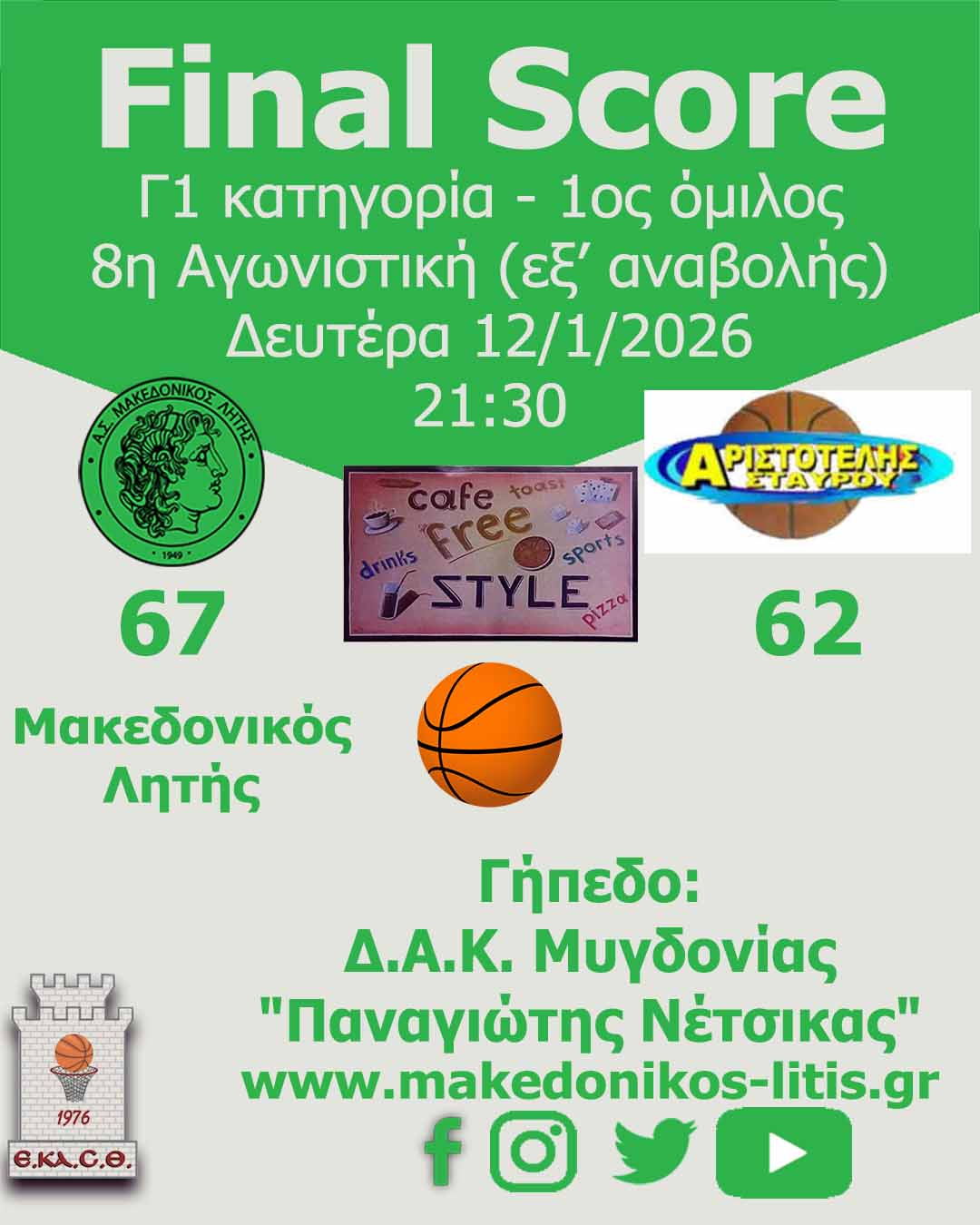 🏀 Με νίκη ξεκίνησε η ομάδα μας το 2026, καθώς για τον εξ’ αναβολής αγώνα της 8ης αγωνιστικής νικήσαμε τον Αριστοτέλη Σταυρού με σκορ 67-62