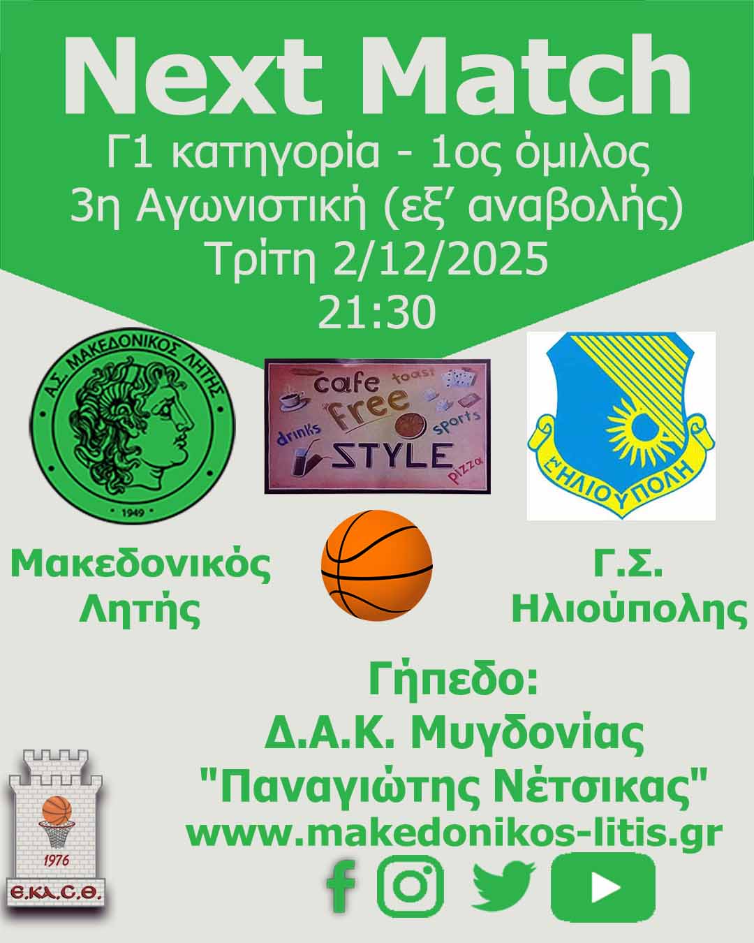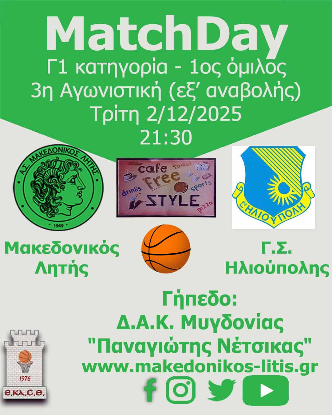 Περισσότερα: 🏀 Μακεδονικός Λητής - Γ.Σ. Ηλιούπολης (Match Day)