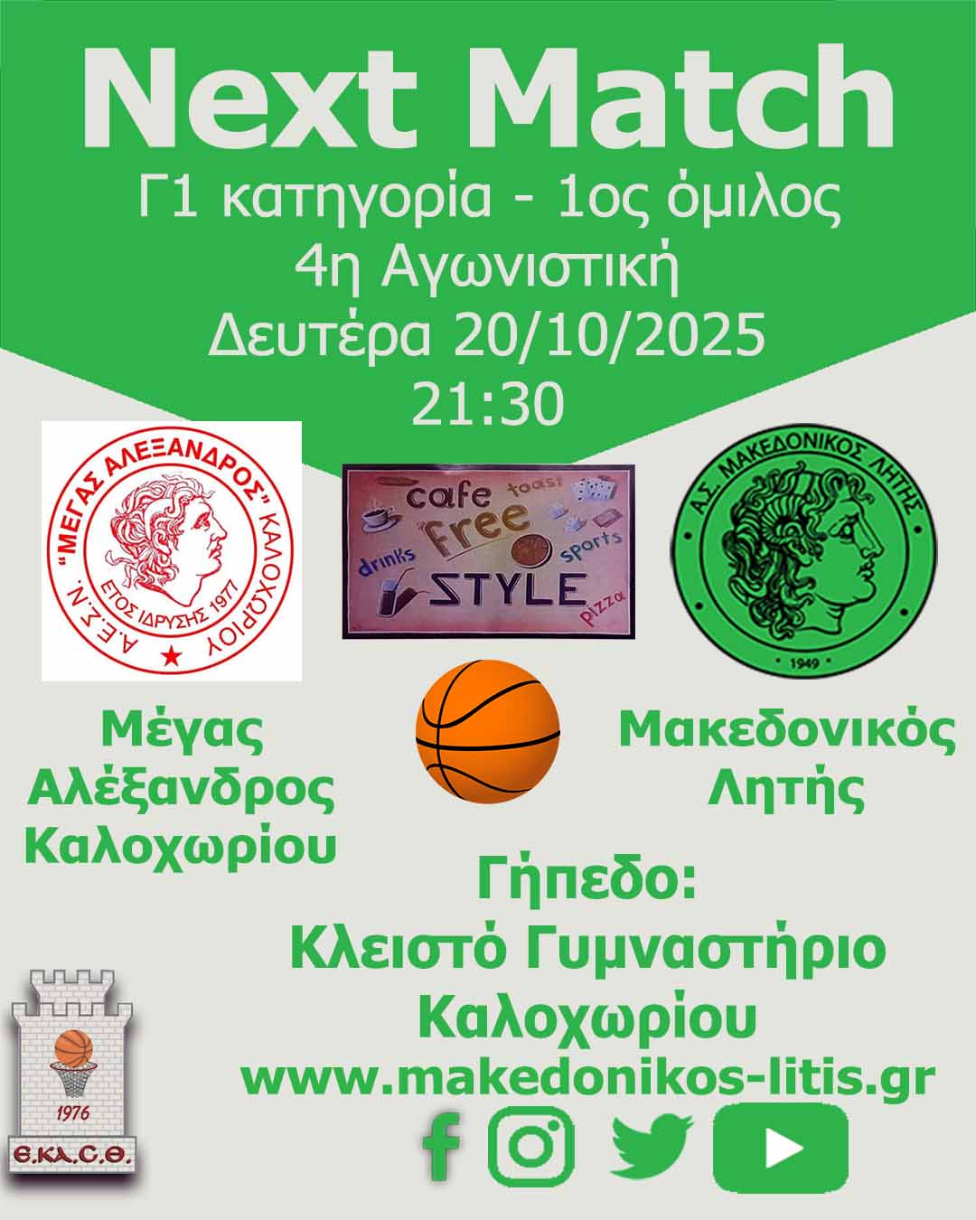 Μετά από την αναβολή του αγώνα της τρίτης αγωνιστικής, η ομάδα μας φιλοξενείται στην δύσκολη έδρα του Μέγα Αλέξανδρου Καλοχωρίου.